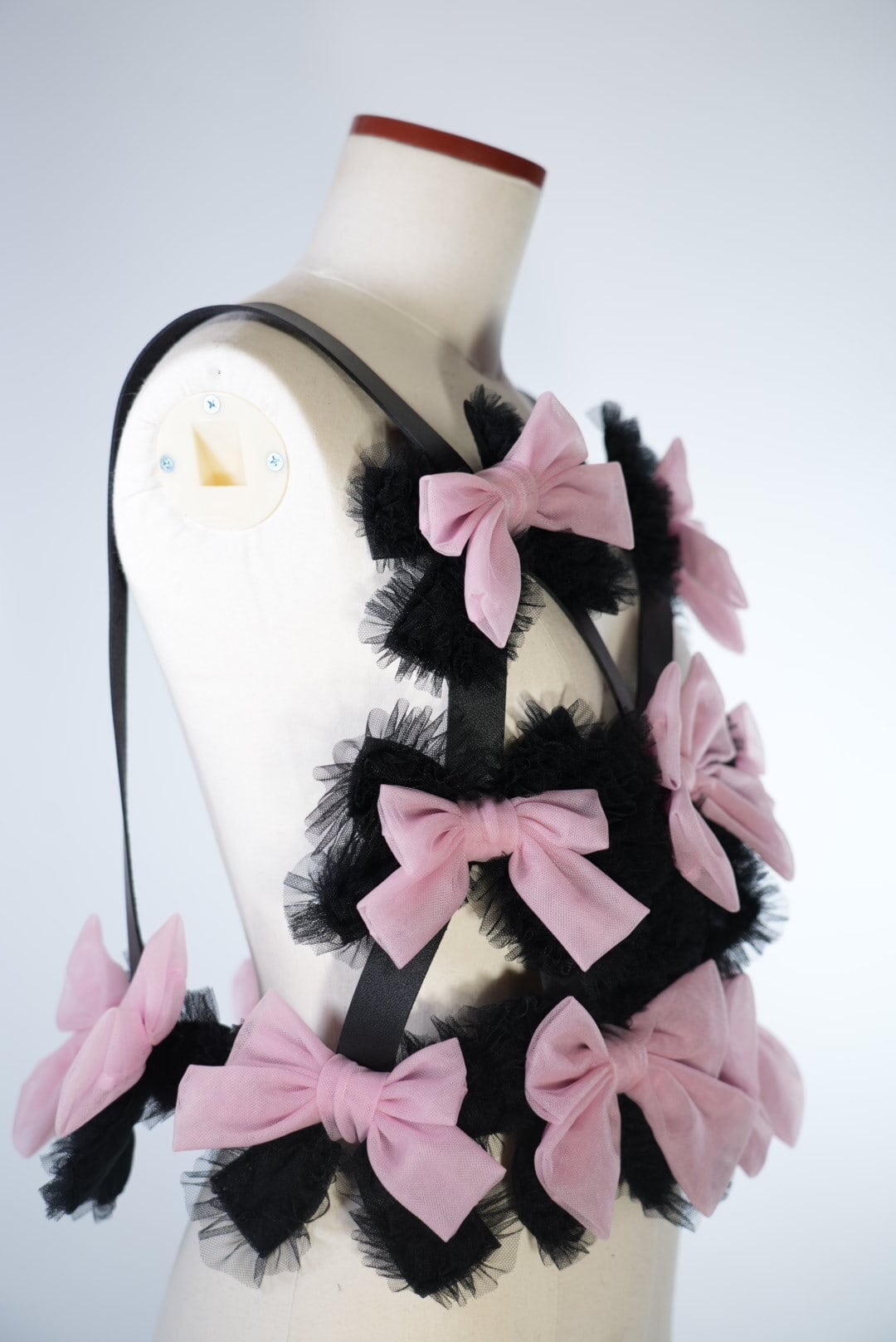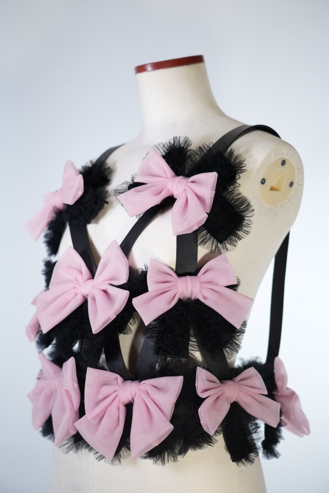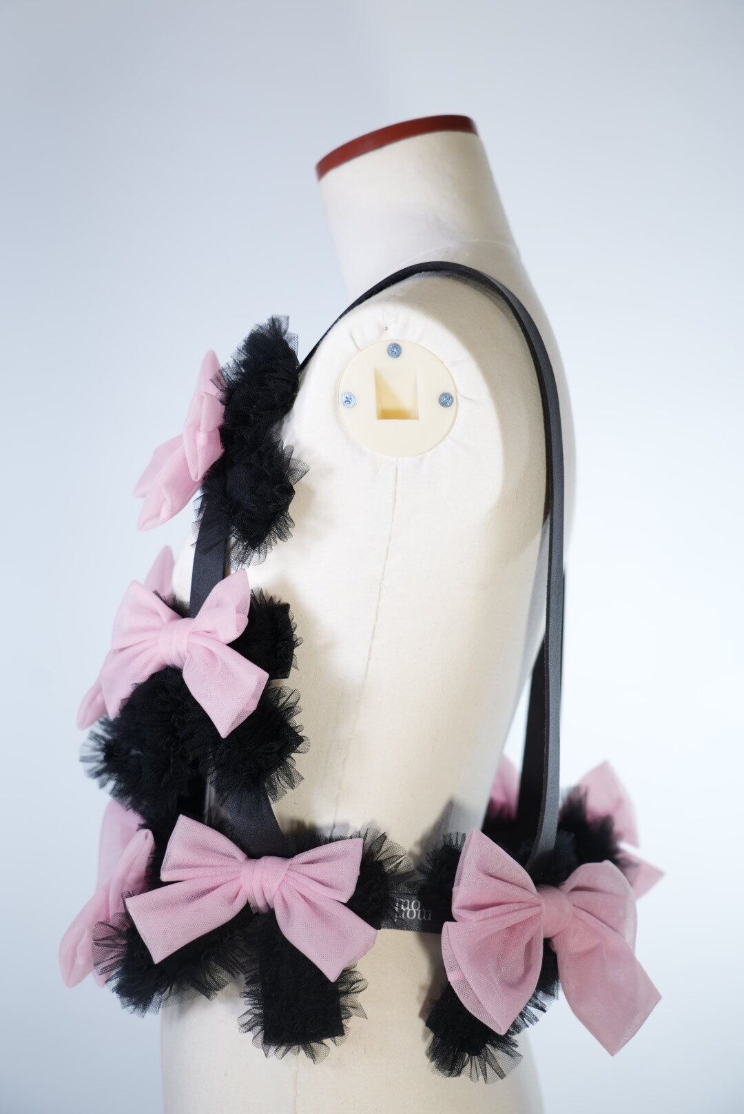 身体全体を包み込むように配置されたピンクのリボンと黒のチュール。甘くて可愛い印象の中にどこか強さを感じるハーネスデザインです。