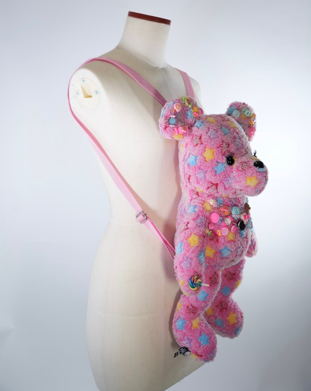 ポップな星柄の生地でできたくまのぬいぐるみバッグ。カラフルなキャンディやスイーツのモチーフが散りばめられ、夢の中の世界をそのまま形にしたようなバックです。