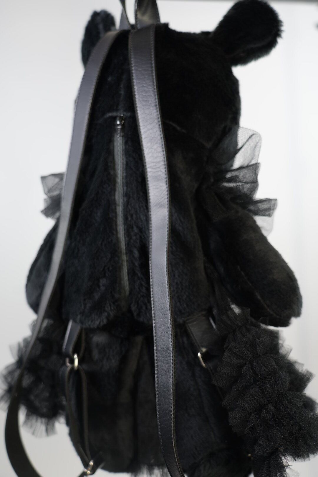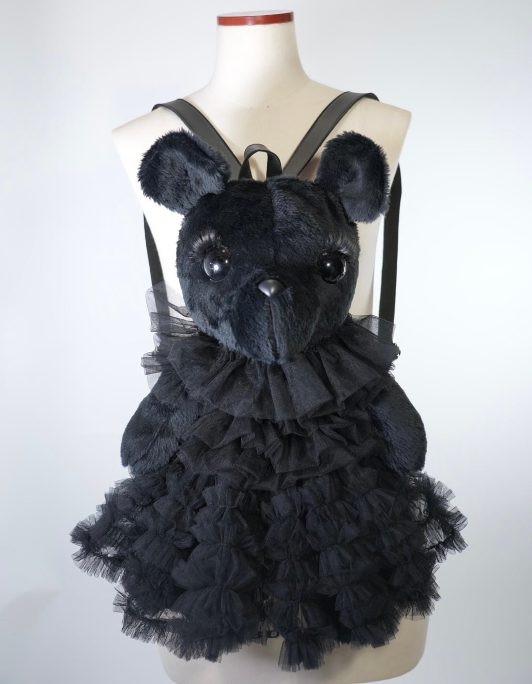 漆黒のファーとボリュームたっぷりのチュールを組み合わせた、テディベア型のバッグです。