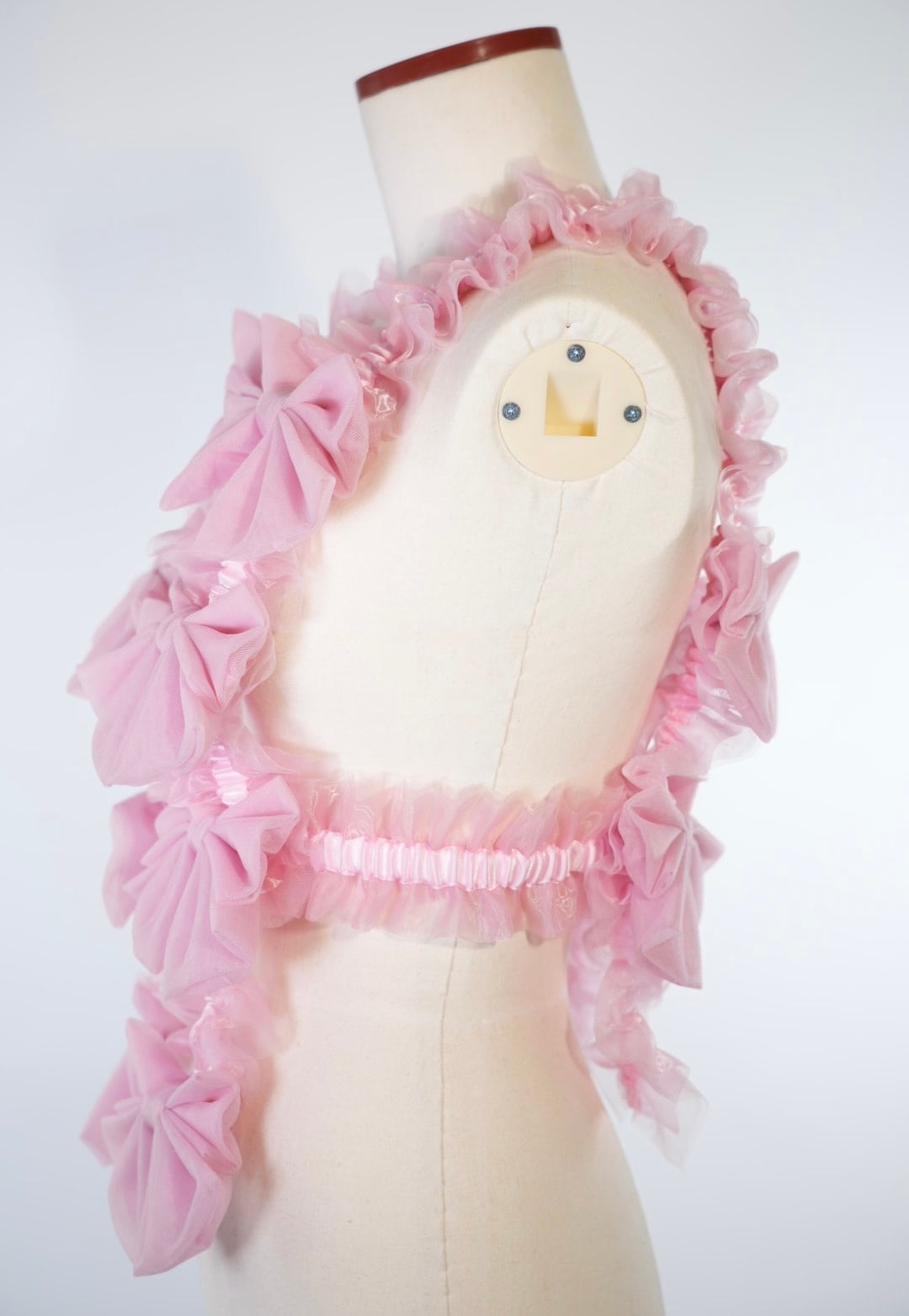 たっぷりのフリルと大きなリボンを連ねた、夢のようなピンクのハーネス。